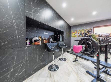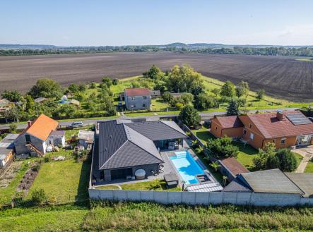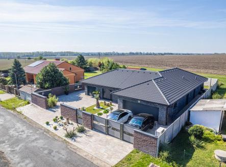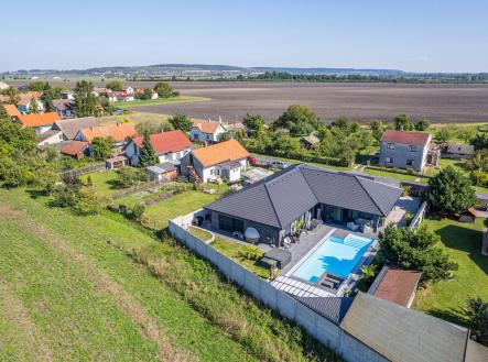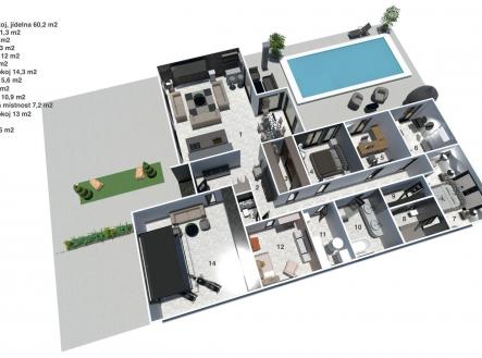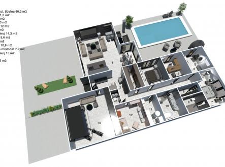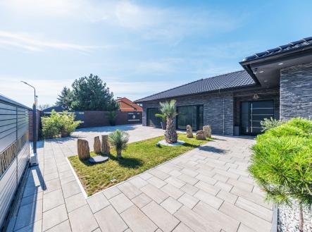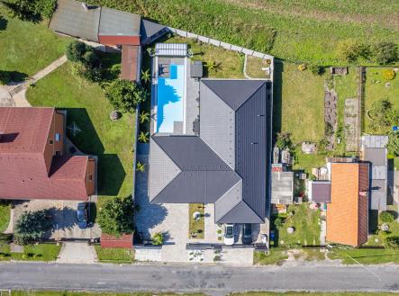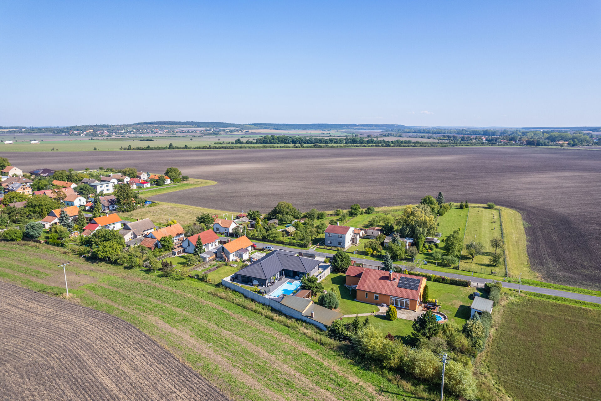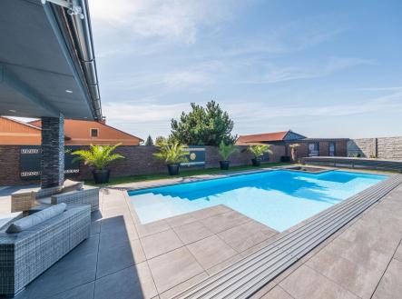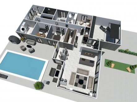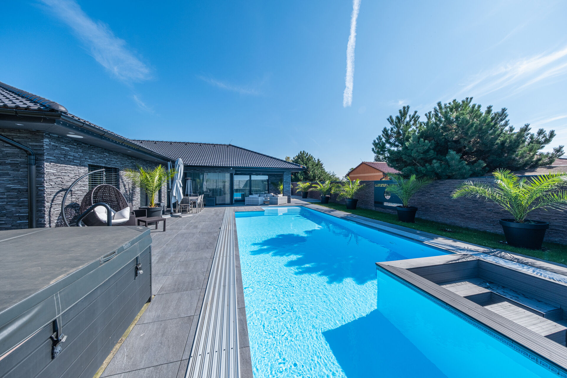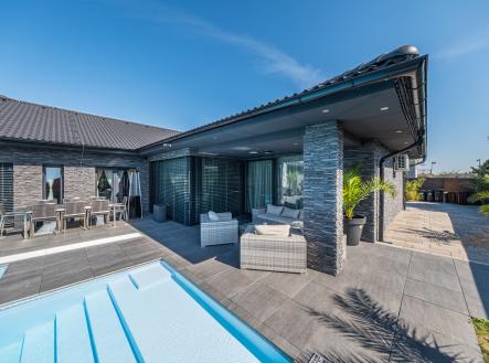 Bungalov o velikosti 6+kk a garáží pro dva automobily a zázemím pro všechny náročné nadšence, kteří chtějí mít v domě svůj vlastní pánský prostor, 11ti metrovým krytým vyhřívaným bazénem, v něm vsazeném sezení, vířivkou pro šest osob a všemi nejmodernějšími technologiemi, které současný trh nabízí, má žitnou plochu 241,3 m² a celkovou zastavěnou plochu krásných 288 m². Dům leží na pozemku o výměře 892 m².