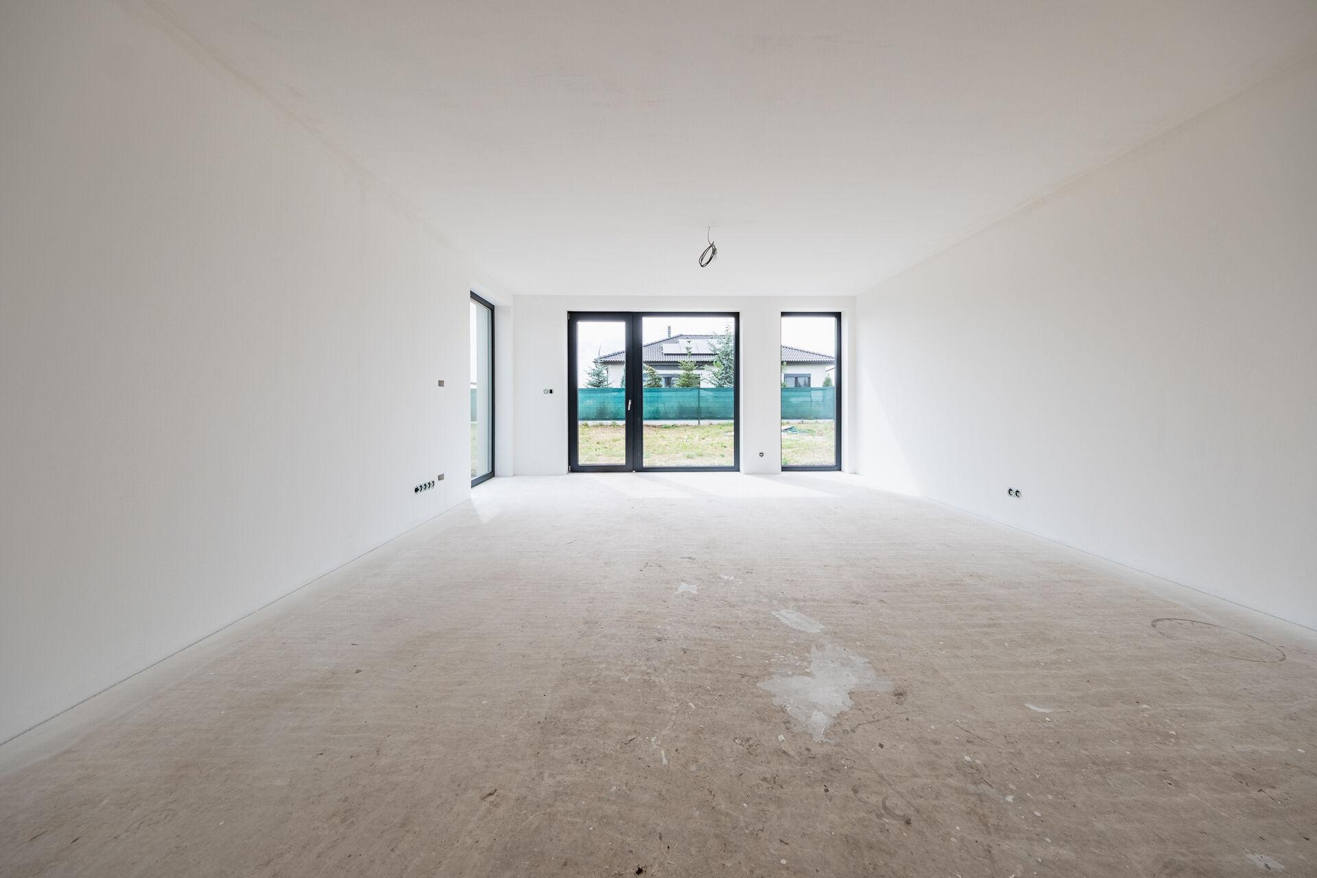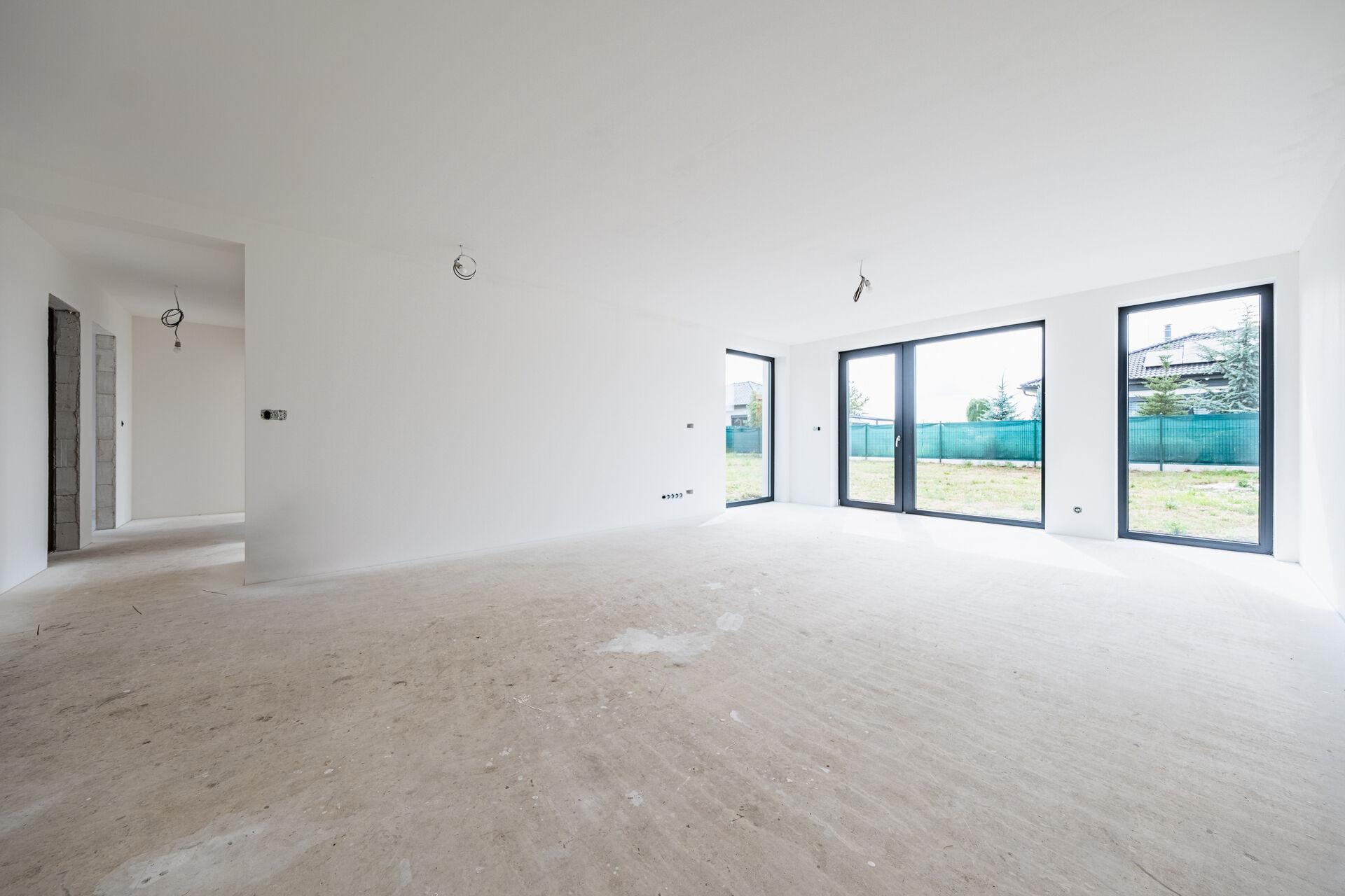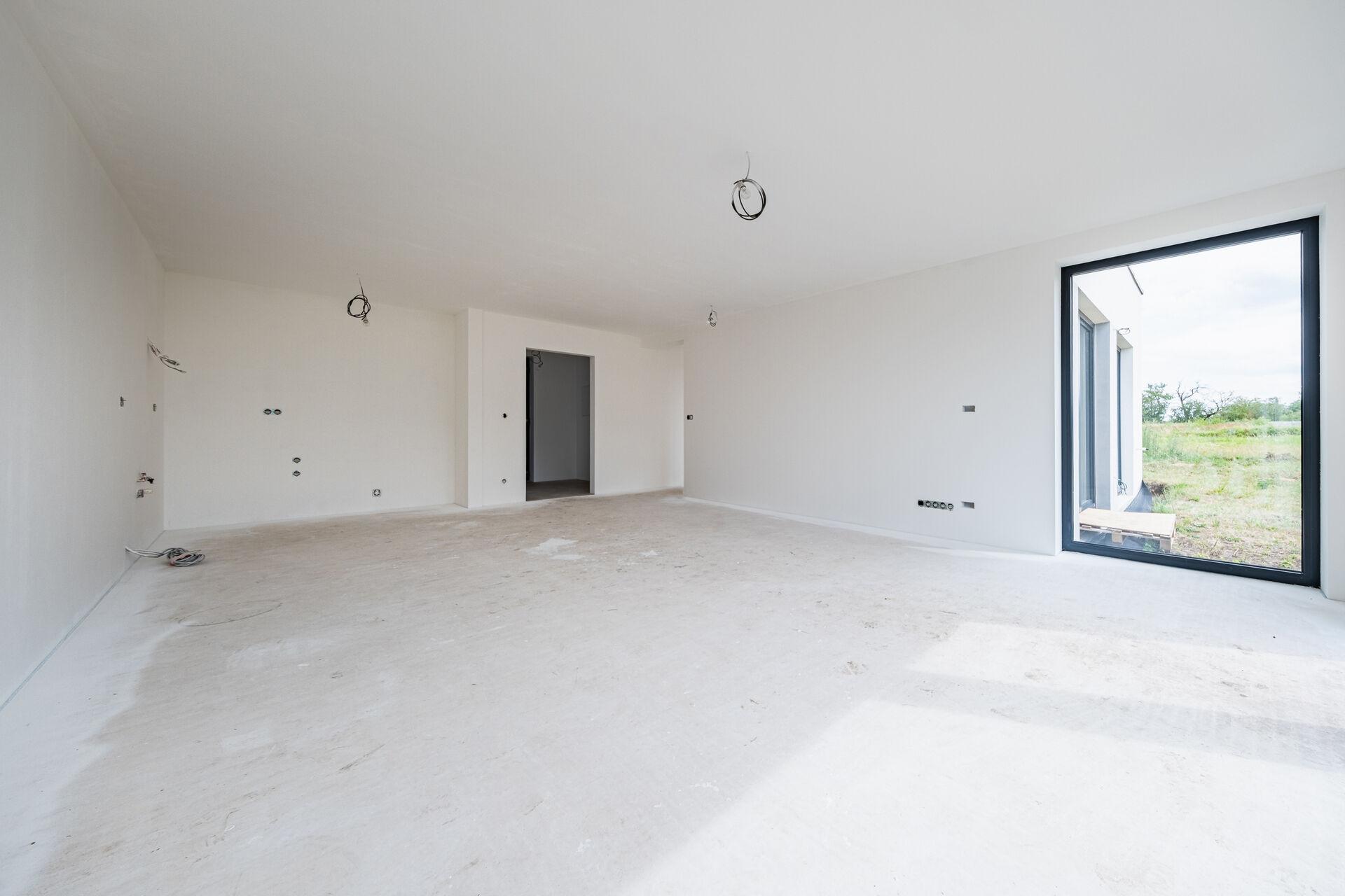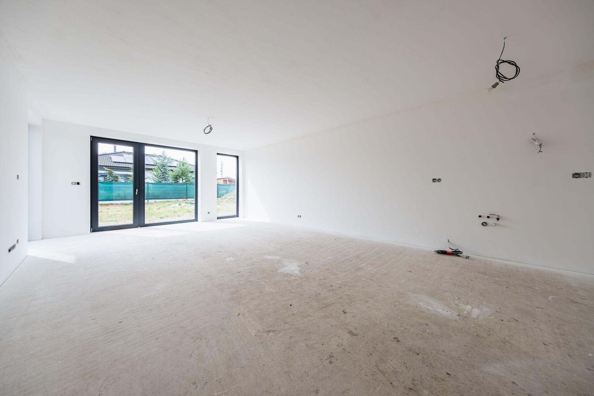 Uvnitř domu vás přivítá otevřený obývací prostor s kuchyňským koutem, jehož velká okna propouštějí dostatek denního světla a propojují interiér s terasou a zahradou – ideálním místem pro relaxaci, dětské hry nebo letní grilování. Kuchyňský kout je připraven pro realizaci vaší vysněné kuchyně na míru.
