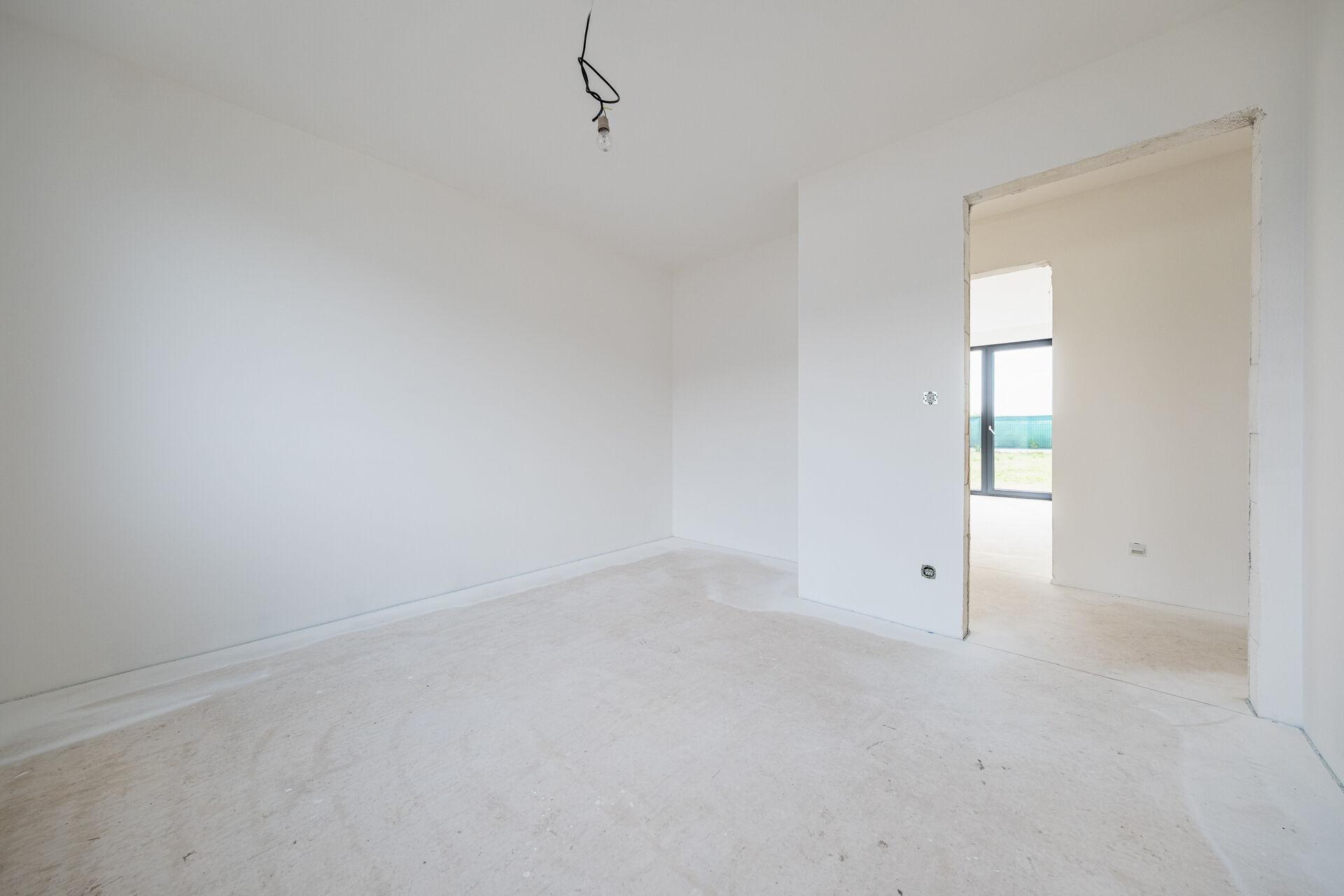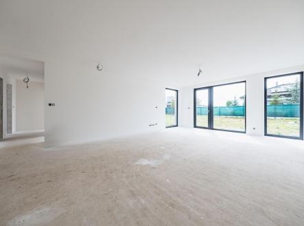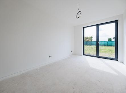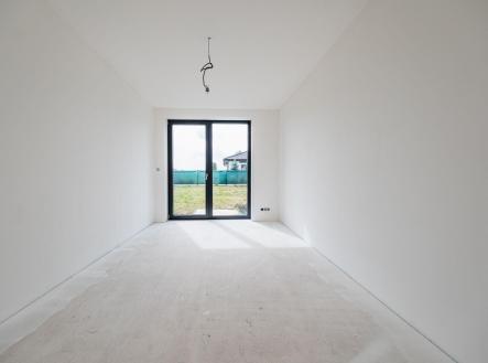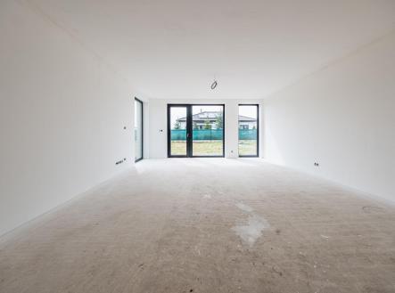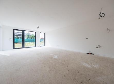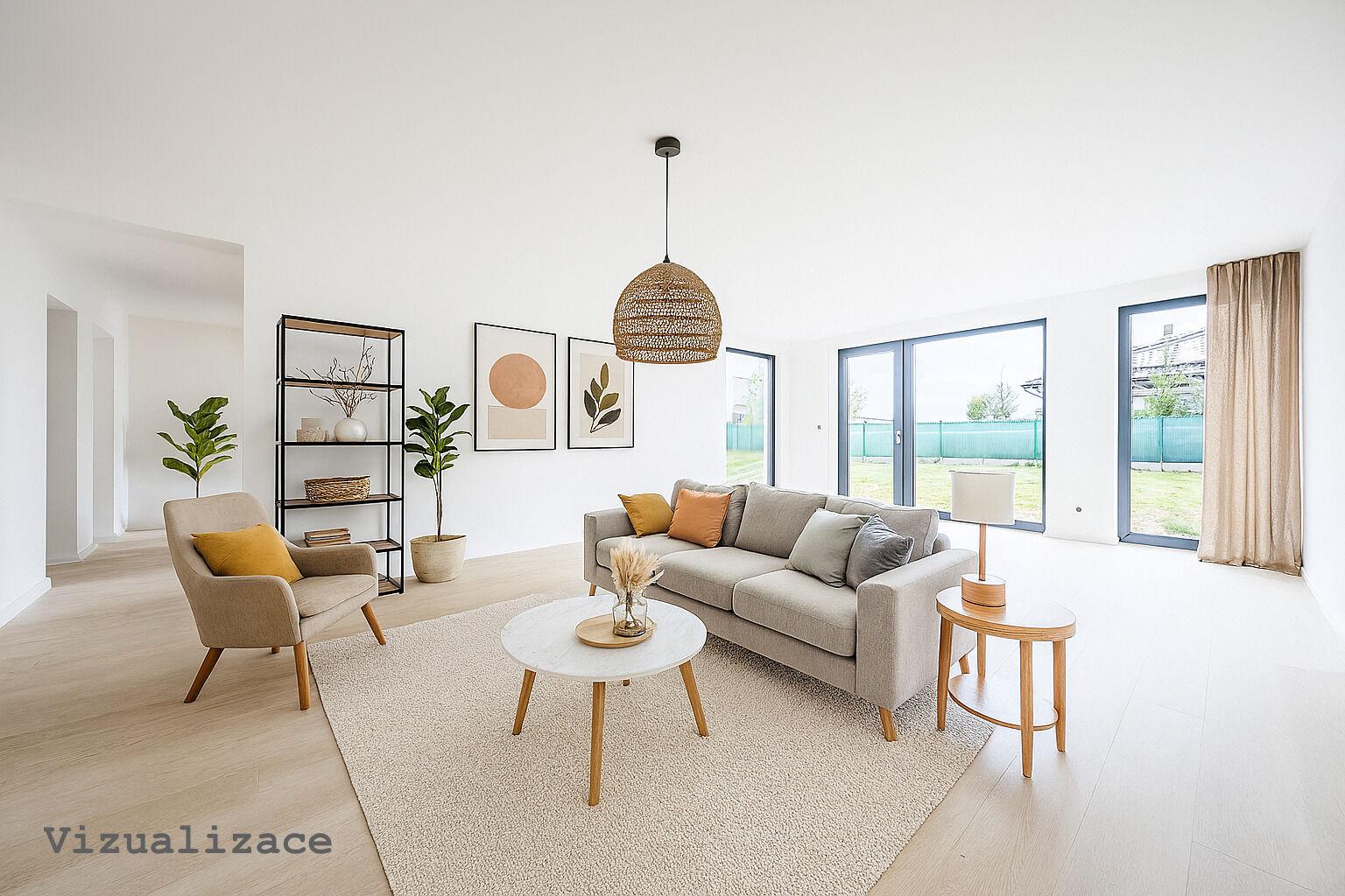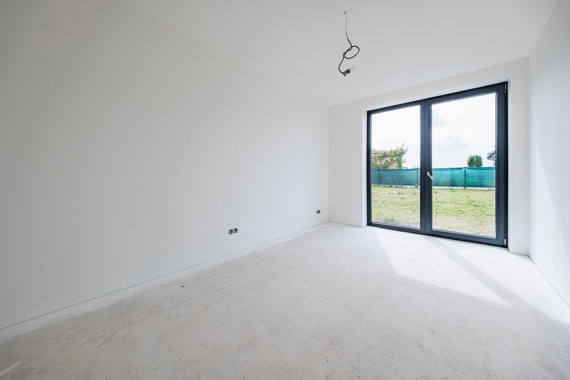 Uvnitř domu vás přivítá otevřený obývací prostor s kuchyňským koutem, jehož velká okna propouštějí dostatek denního světla a propojují interiér s terasou a zahradou – ideálním místem pro relaxaci, dětské hry nebo letní grilování. Kuchyňský kout je připraven pro realizaci vaší vysněné kuchyně na míru.