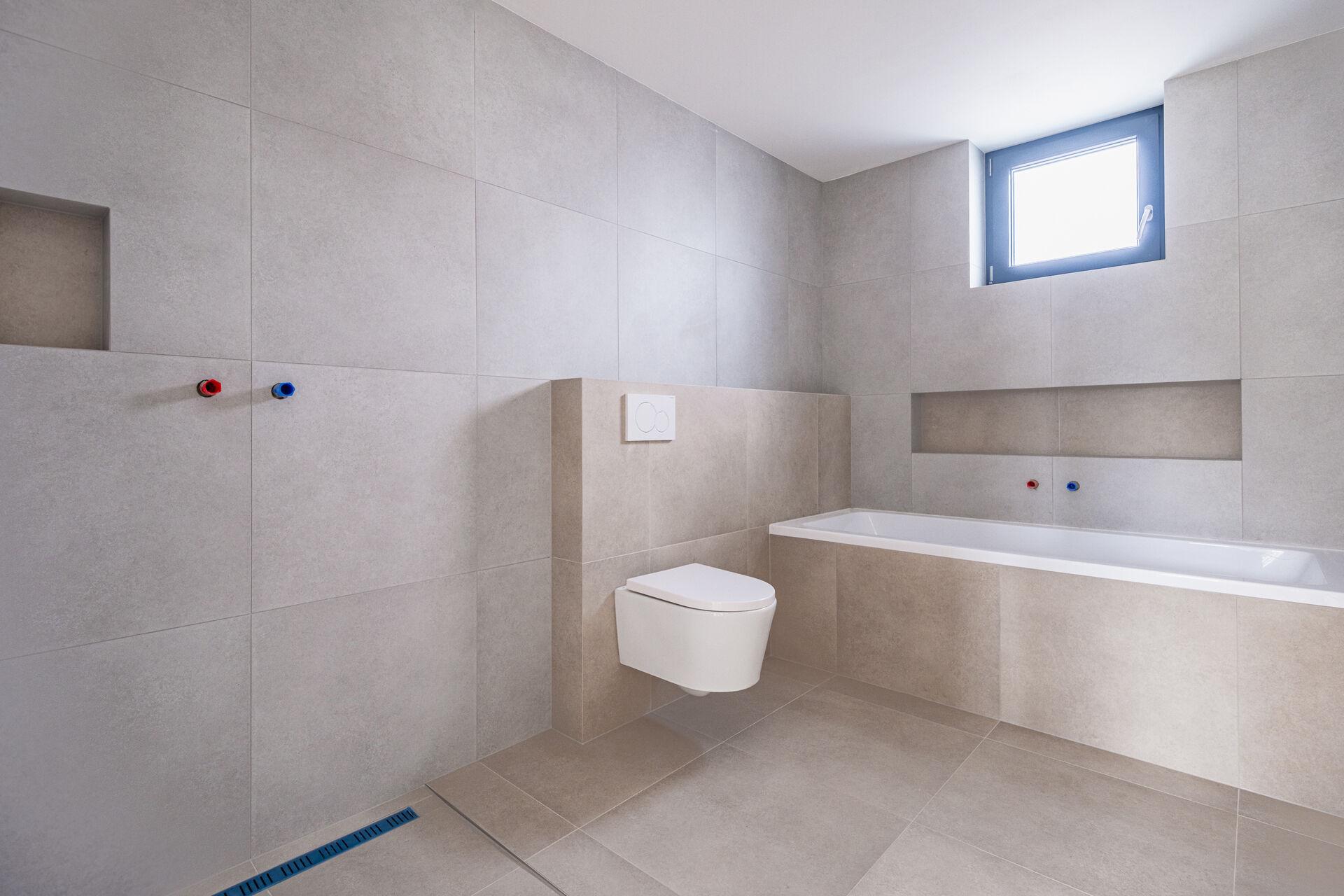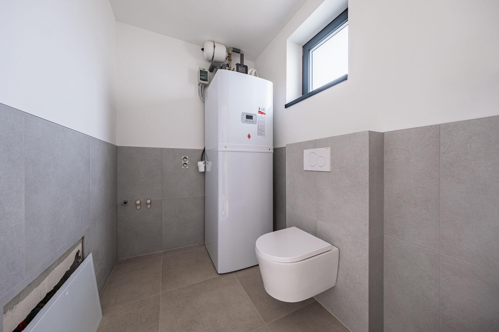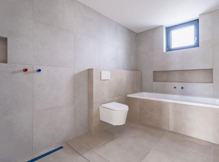 Dále v přízemí najdete koupelnu s vanou a toaletou, technickou místnost s místem pro pračku a sušičku, a samozřejmě vstupní zádveří.