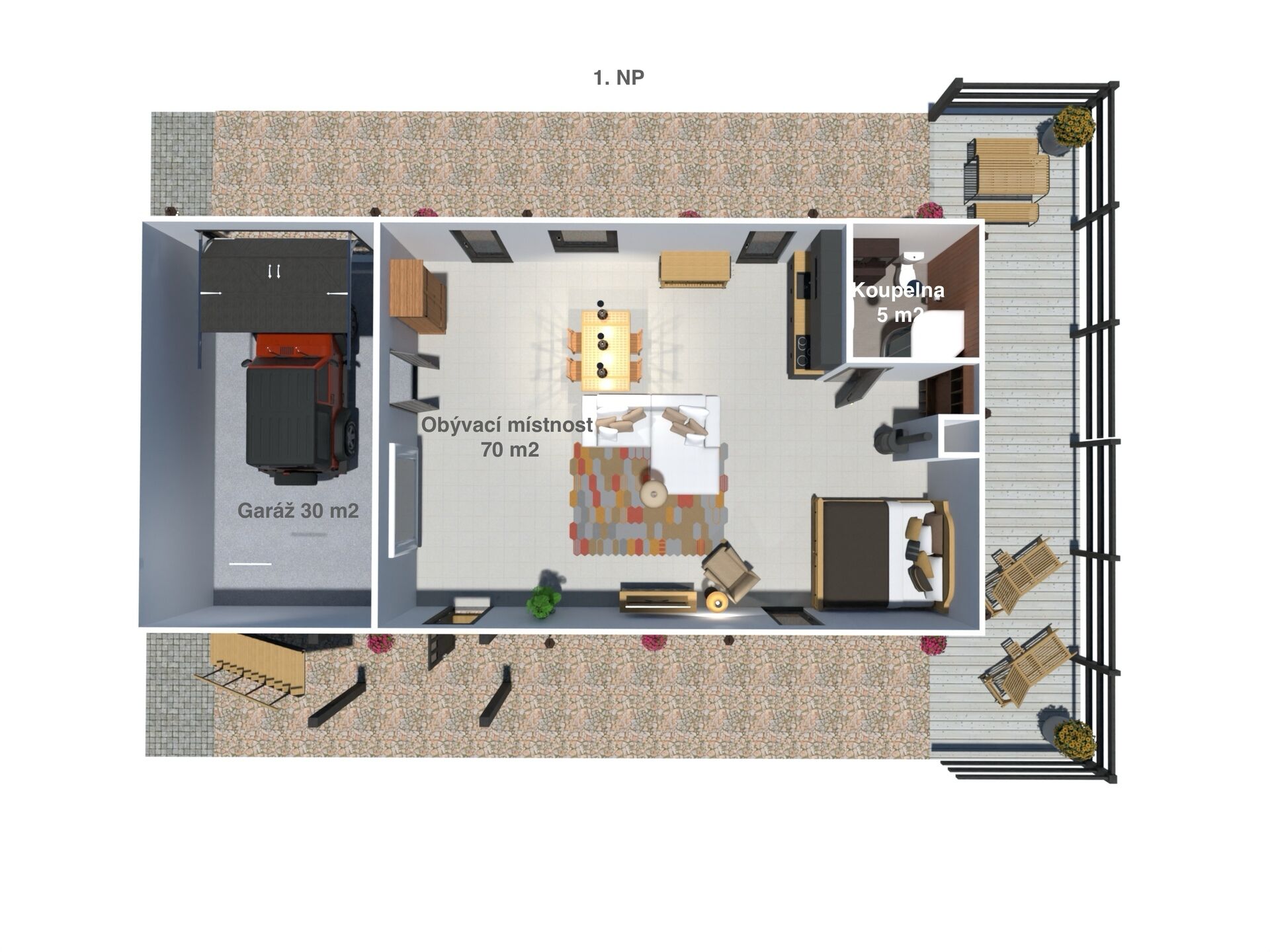 • Přízemí: otevřený ateliérový prostor s kuchyňským koutem, jídelním zázemím a vstupem do garáže – s vlastním sociálním zařízením.