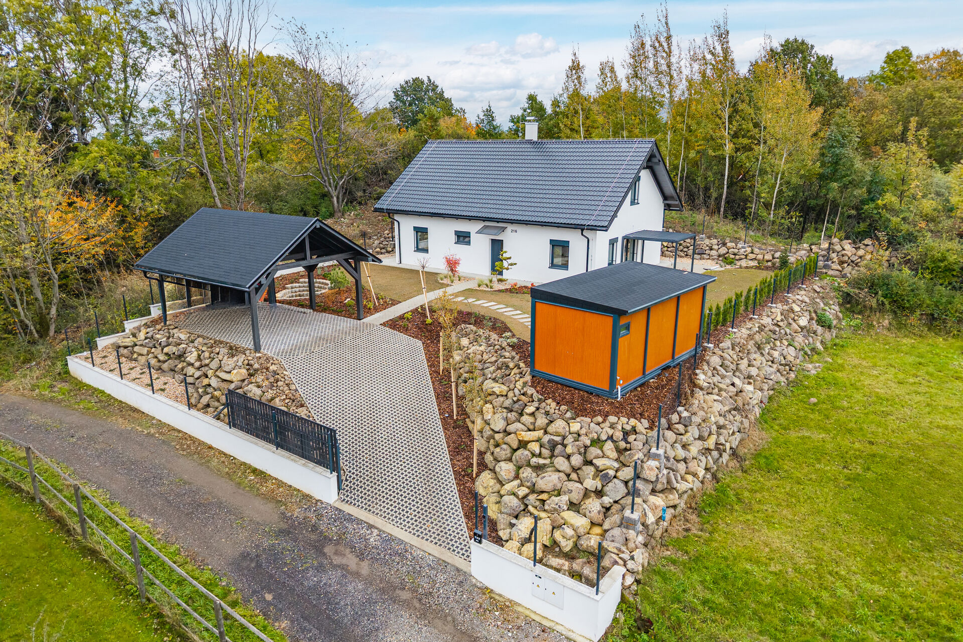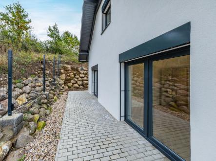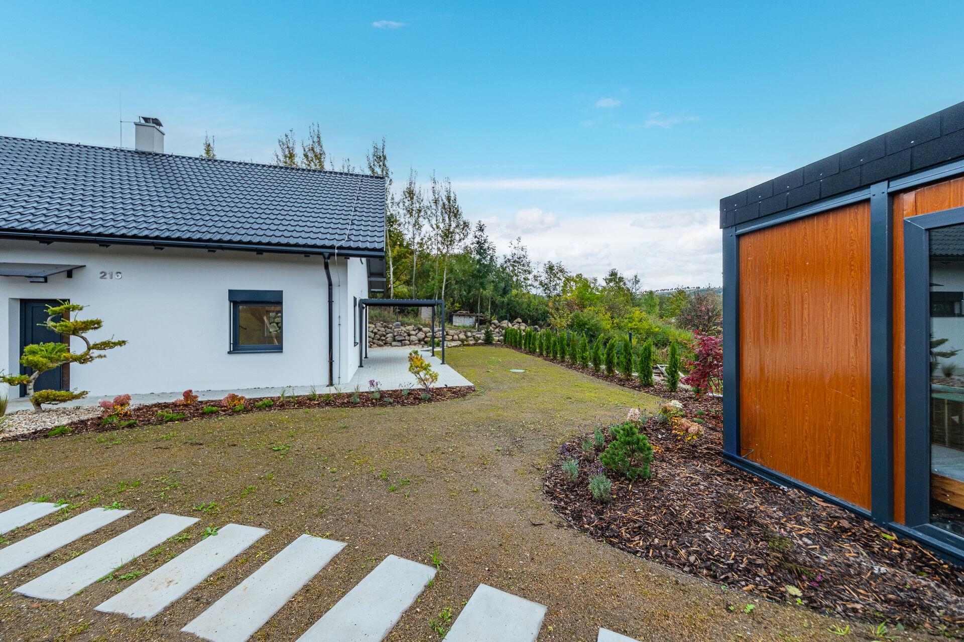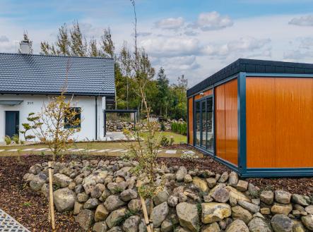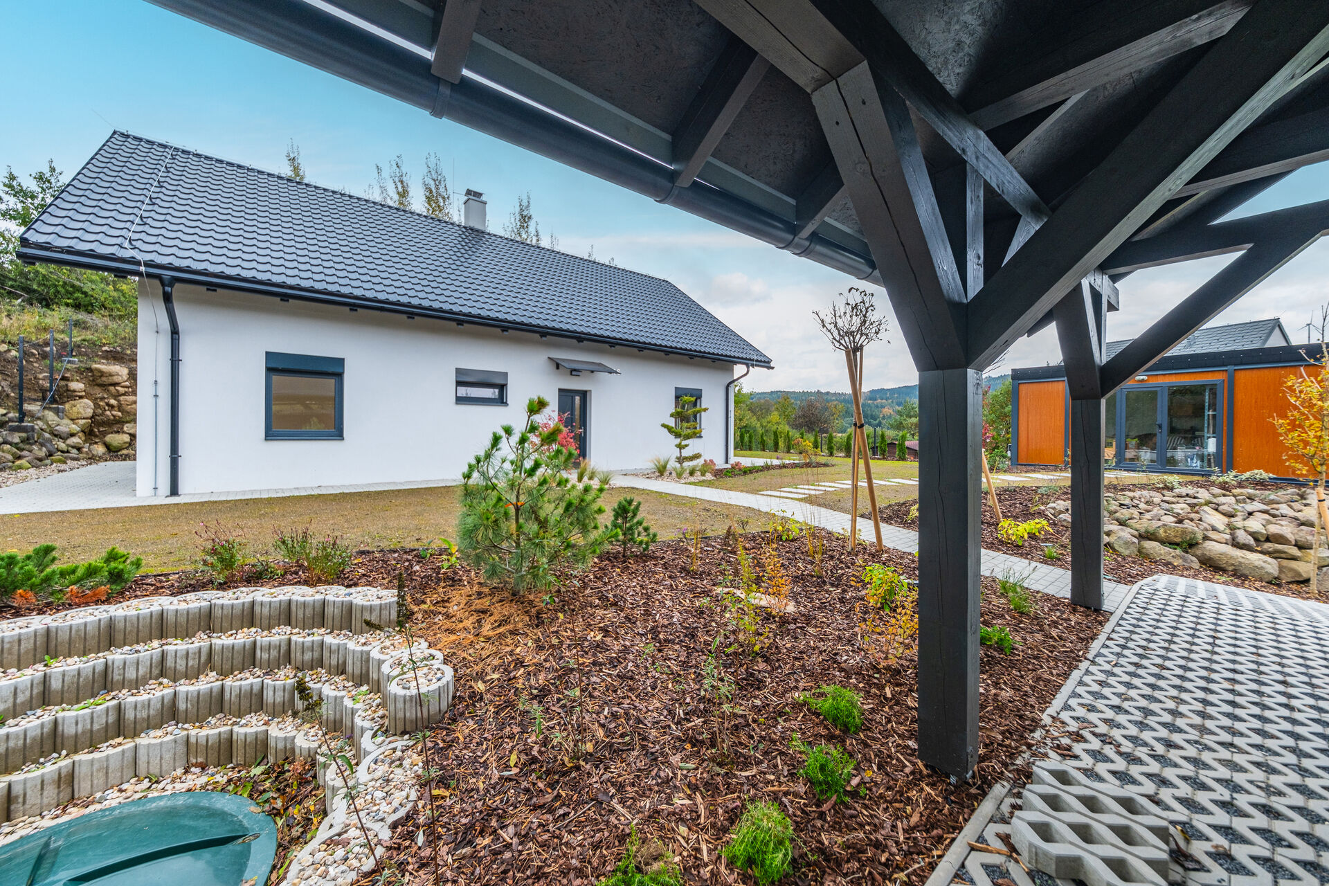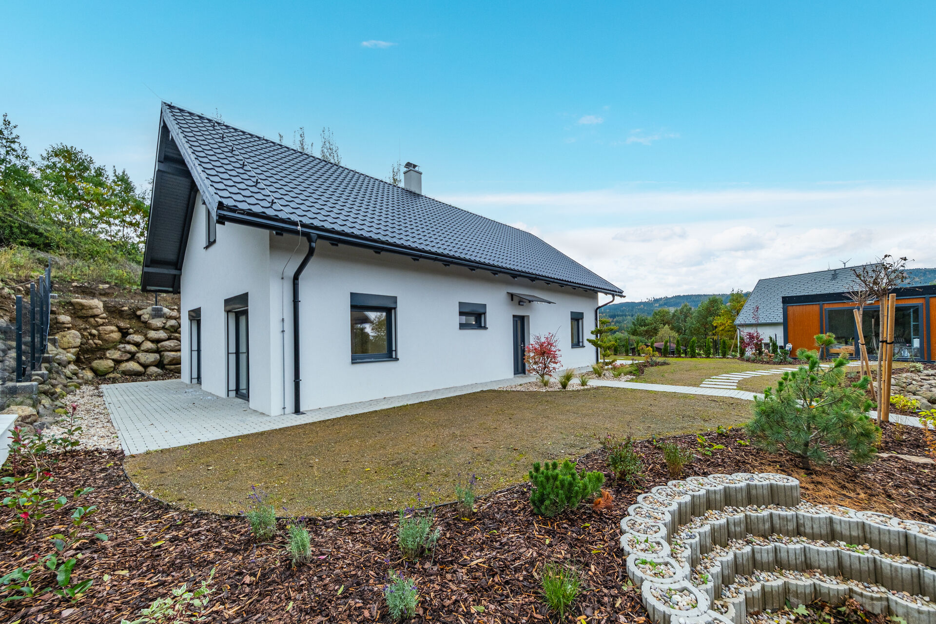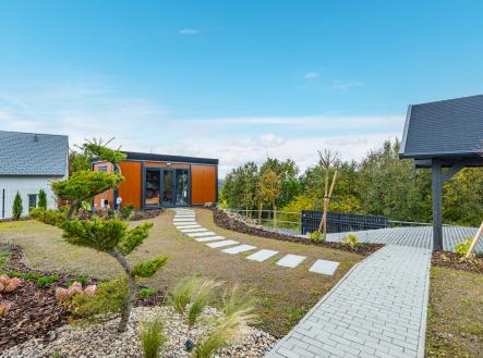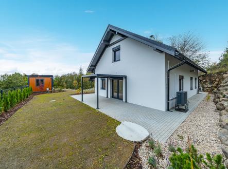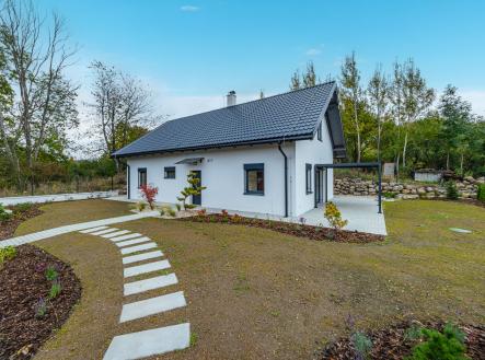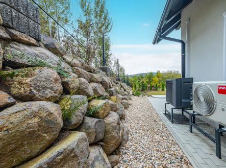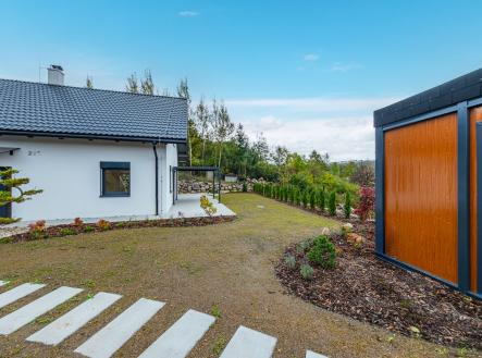 Zahrada je kompletně upravená – nový trávník, nově vysazené stromky, živý plot, květiny, zpevněné chodníky, zatravňovací plochy i elektrická brána na dálkové ovládání. Dům je napojen na vlastní vrtanou studnu, má moderní ČOV, a díky kvalitním materiálům a energetické třídě B je provozně velmi úsporný.