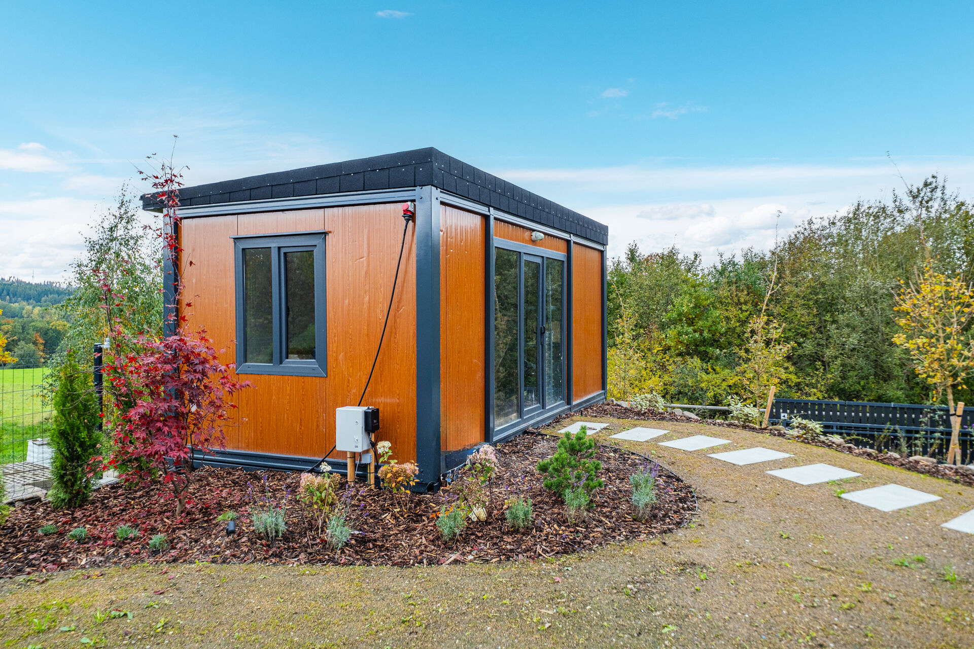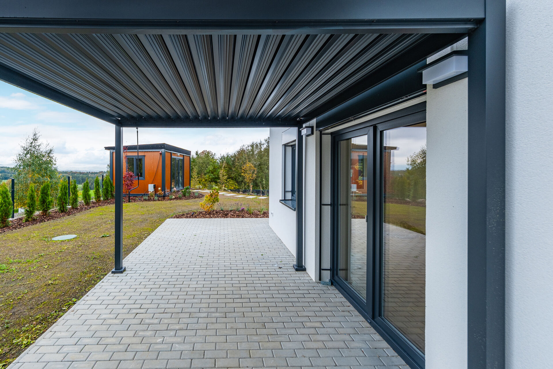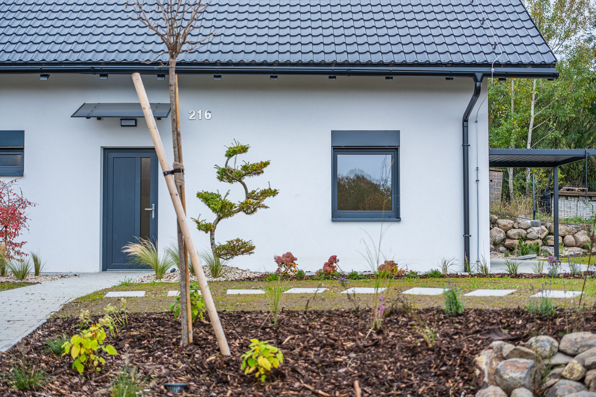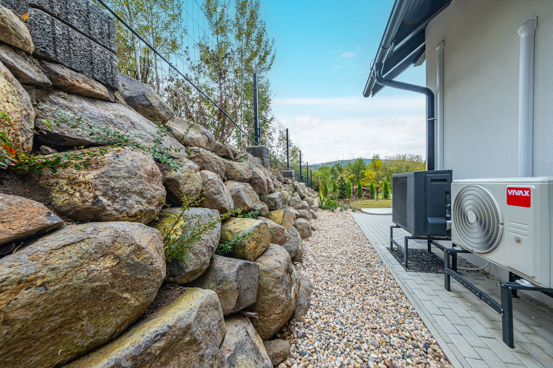 Zahrada je kompletně upravená – nový trávník, nově vysazené stromky, živý plot, květiny, zpevněné chodníky, zatravňovací plochy i elektrická brána na dálkové ovládání. Dům je napojen na vlastní vrtanou studnu, má moderní ČOV, a díky kvalitním materiálům a energetické třídě B je provozně velmi úsporný.