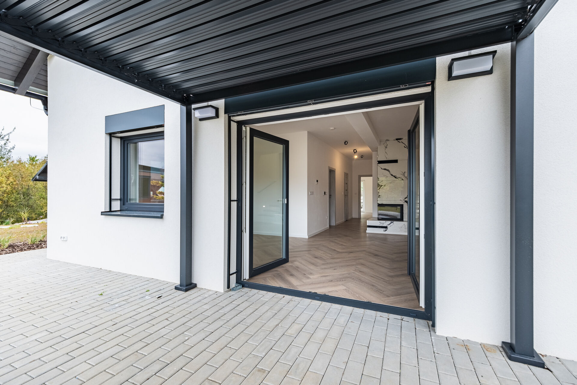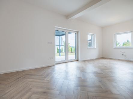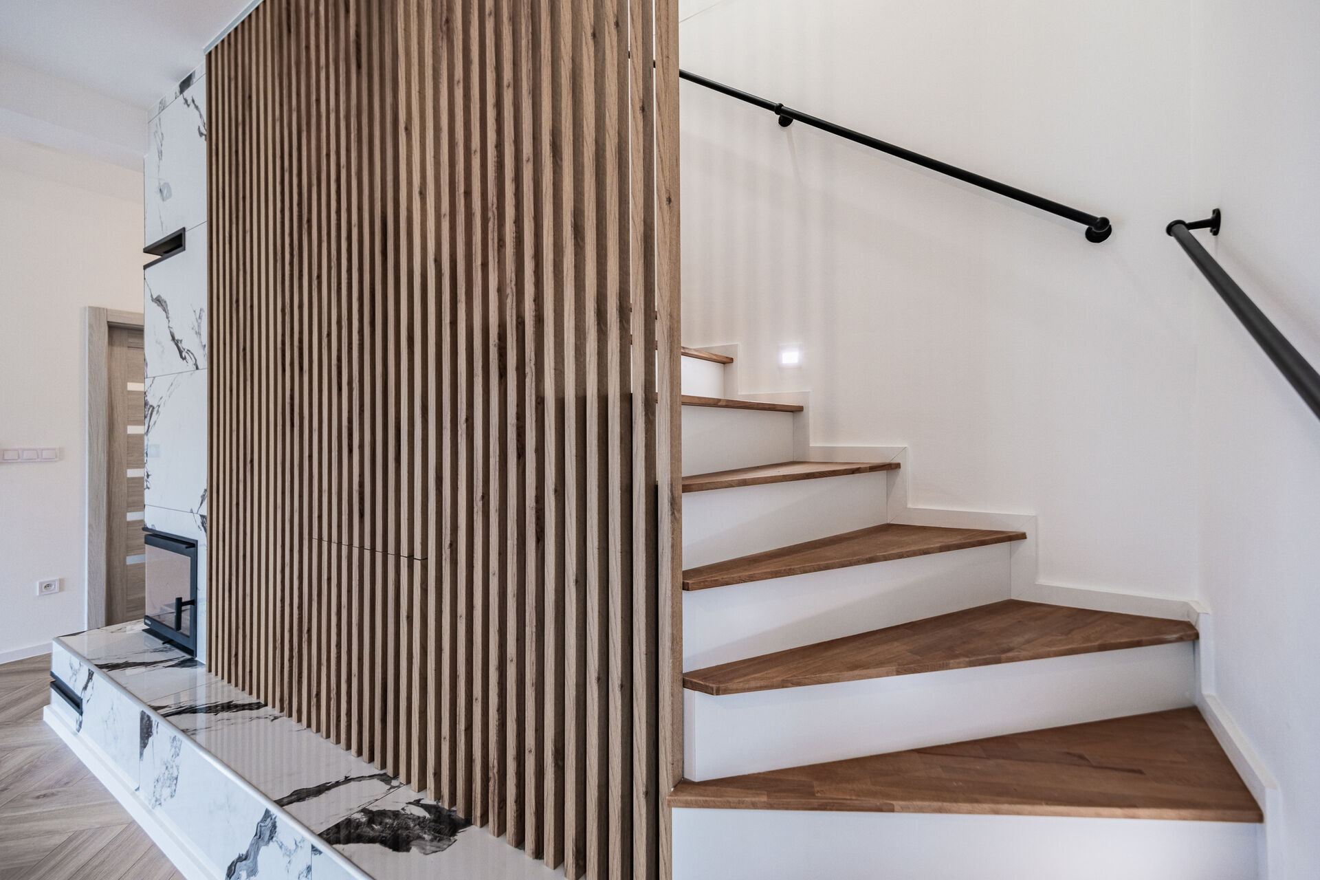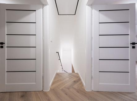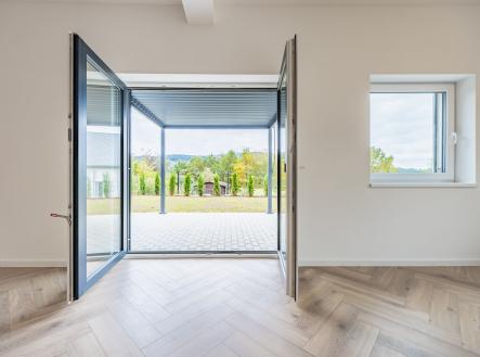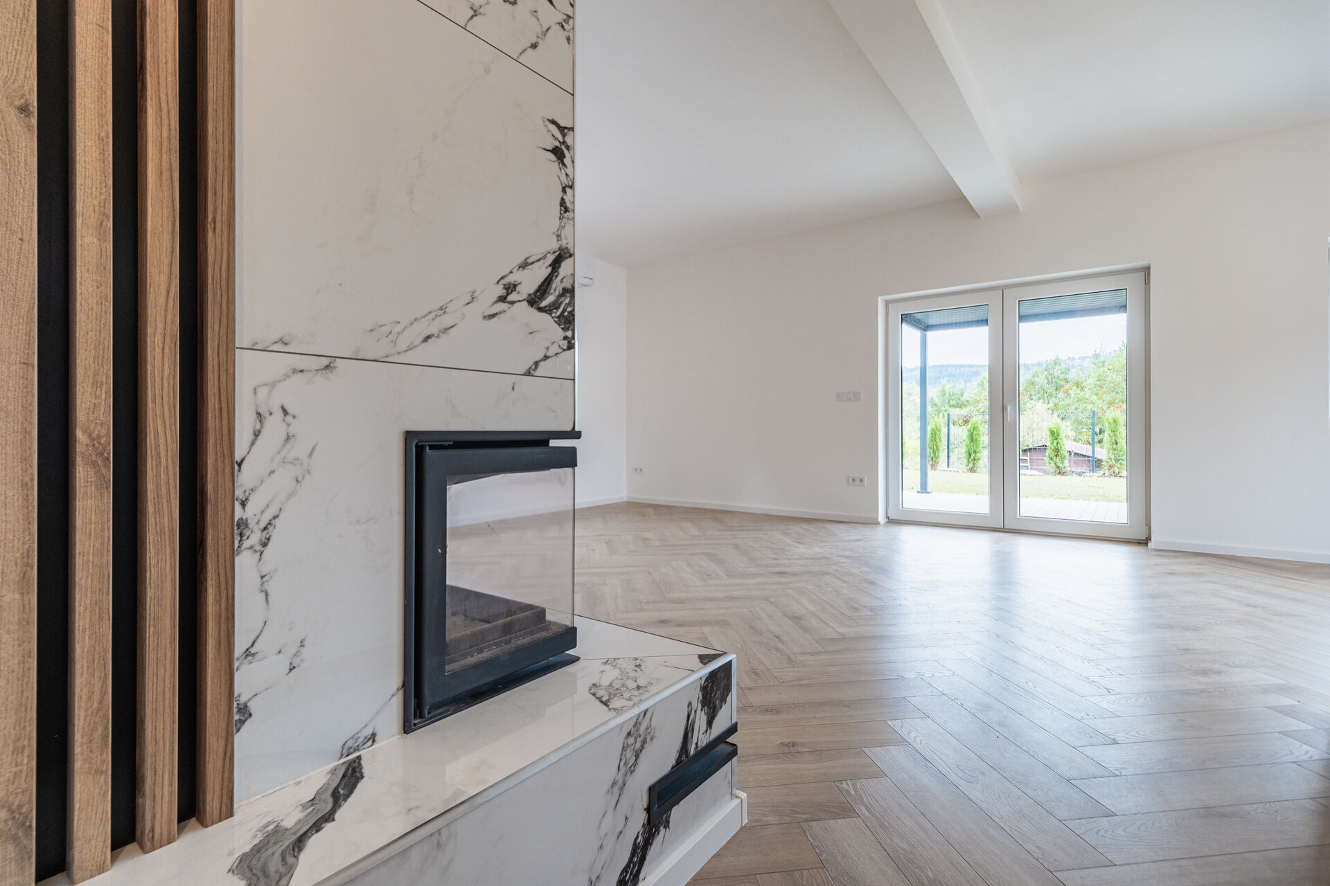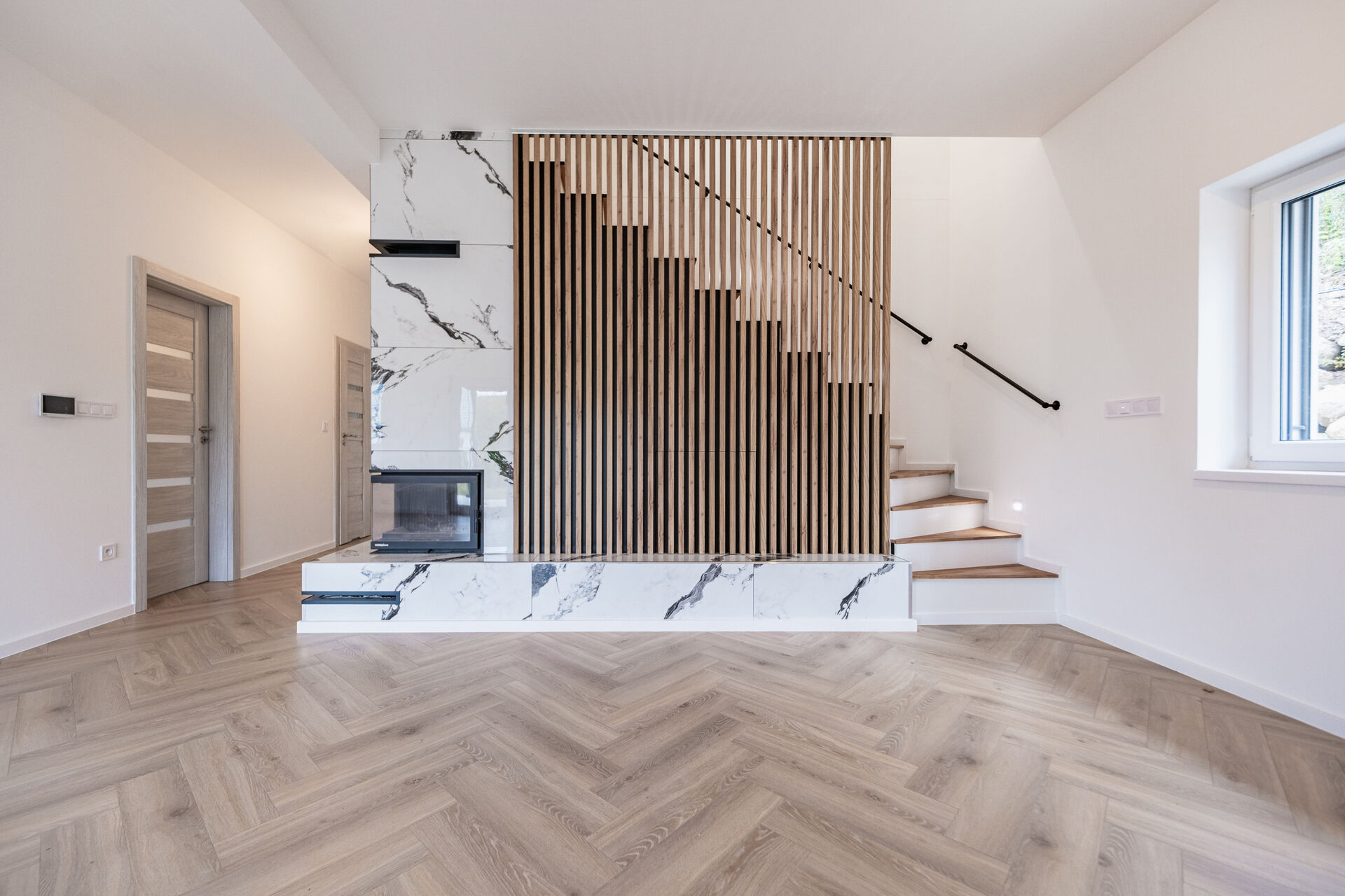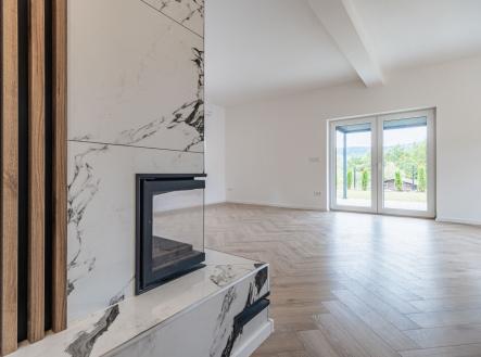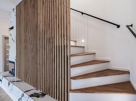 Už při vstupu vás přivítá prostorná předsíň s technickou místností, odkud se otevírá průchod do velkolepého obývacího pokoje. Dominantou je mramorový krb doplněný dřevěnými lamelami, které ladí s elegantními podlahami ve vzoru rybí kosti. Otevřený prostor propojuje moderní kuchyň s jídelnou a navazuje na venkovní terasu.