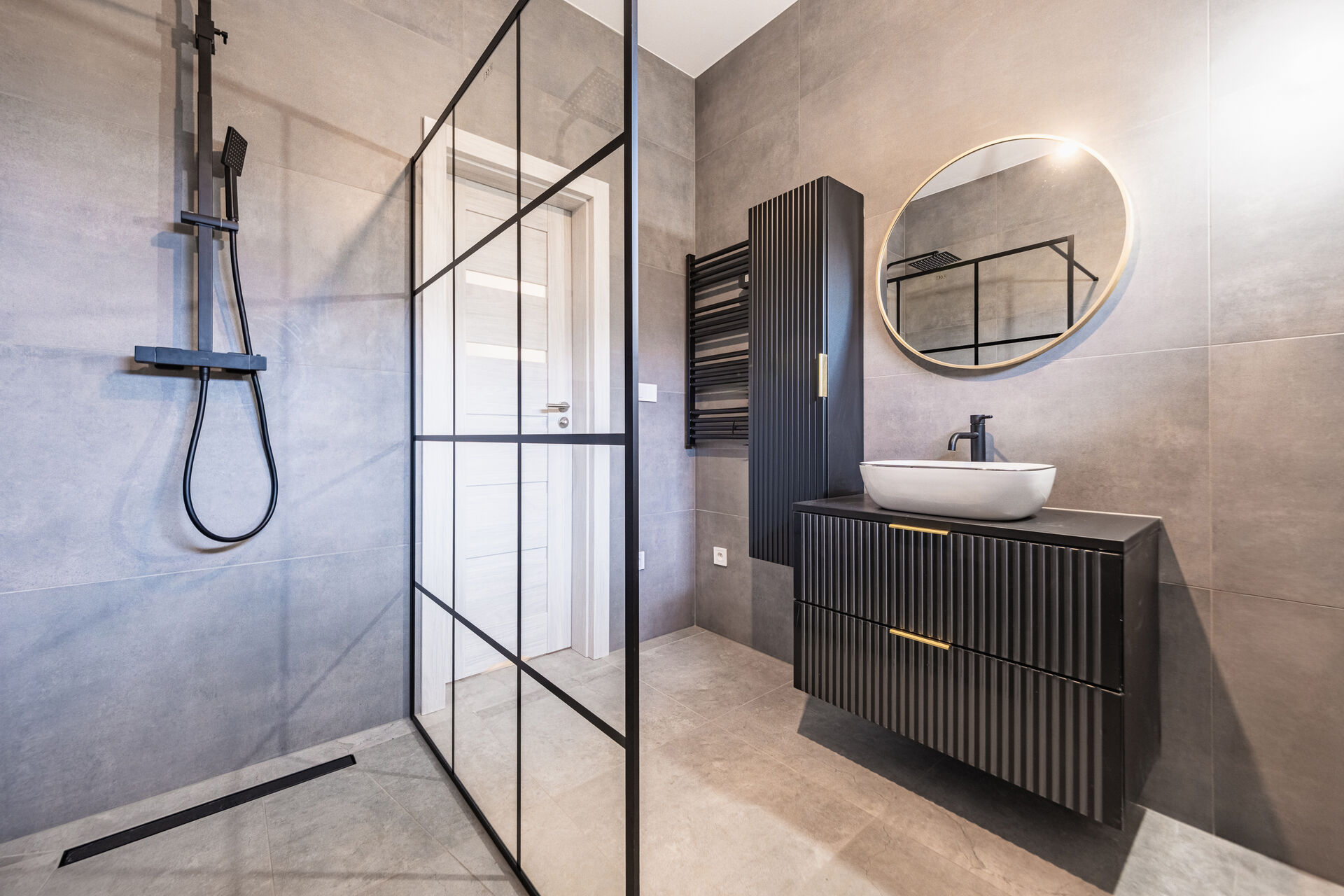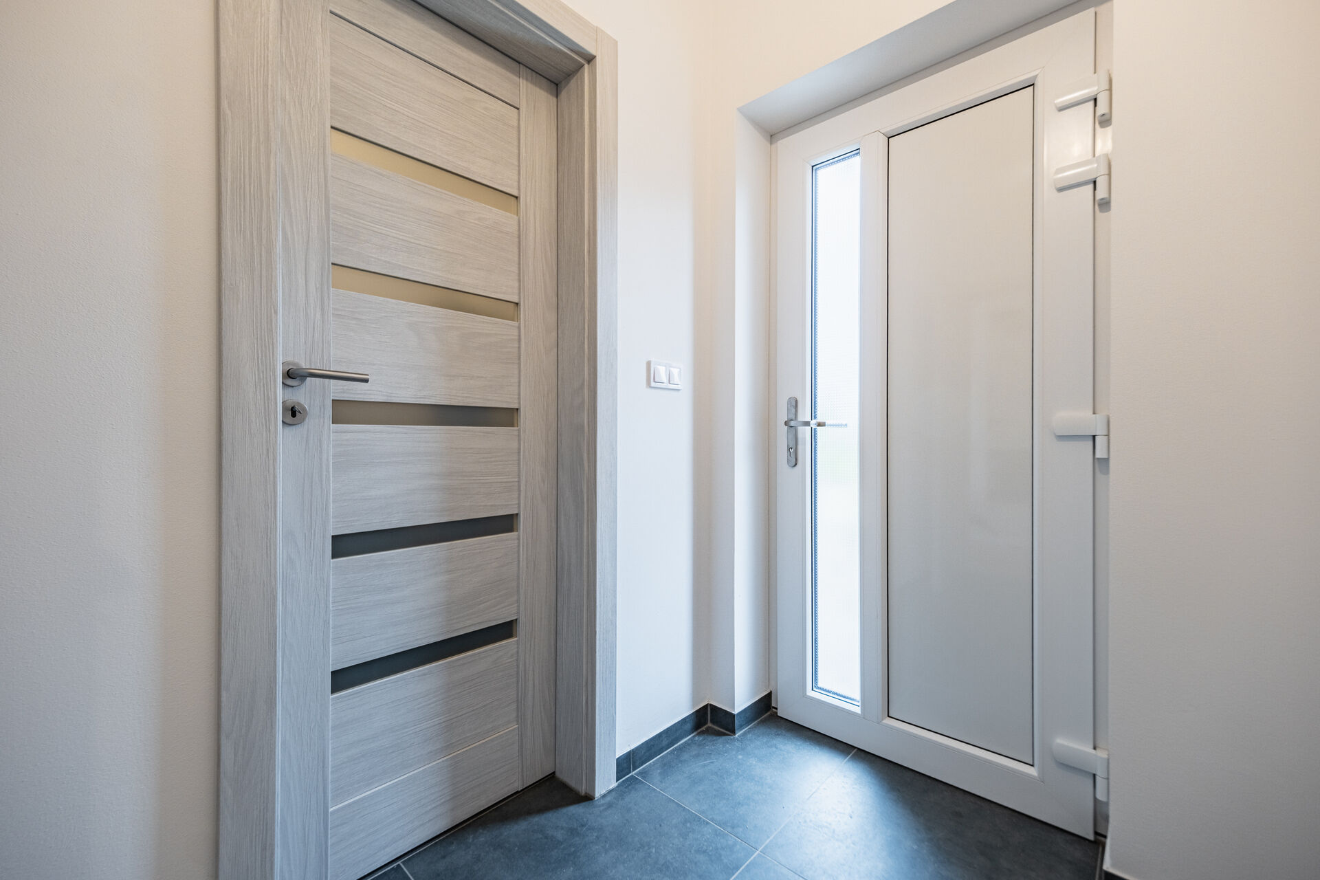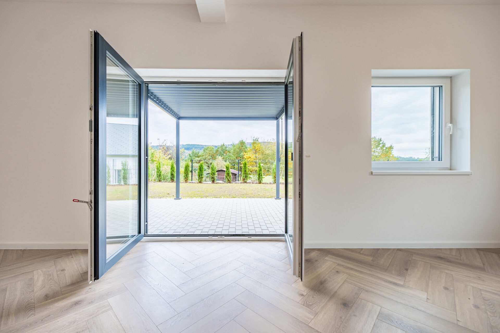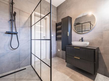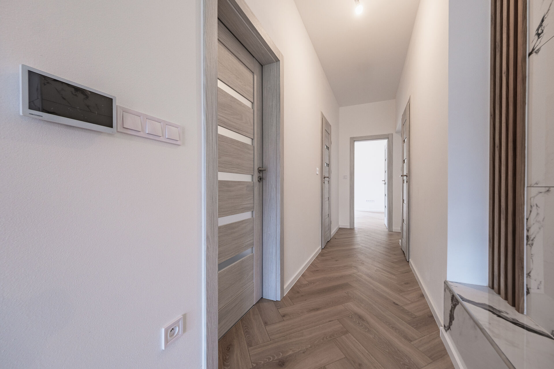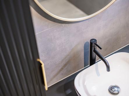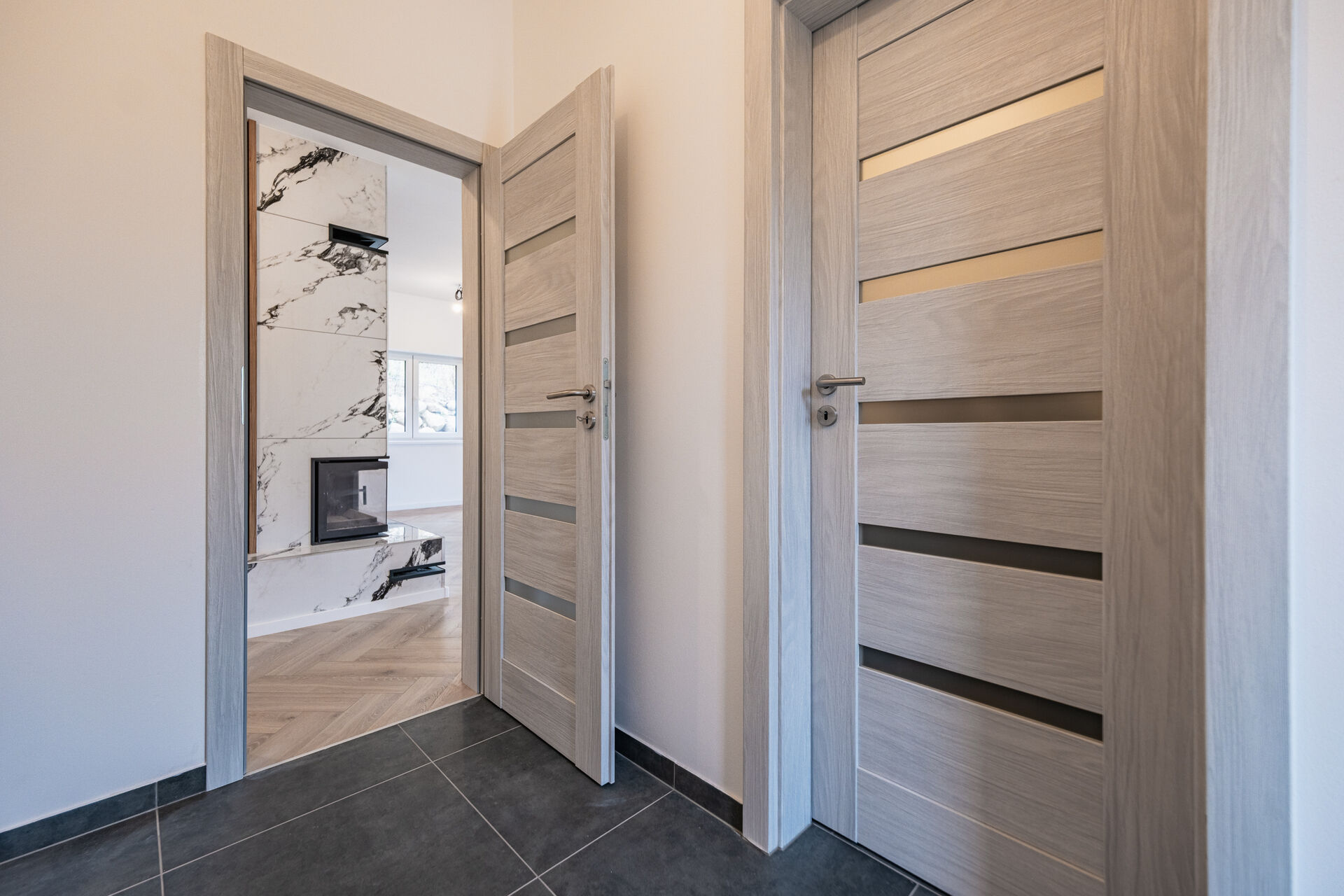 Už při vstupu vás přivítá prostorná předsíň s technickou místností, odkud se otevírá průchod do velkolepého obývacího pokoje. Dominantou je mramorový krb doplněný dřevěnými lamelami, které ladí s elegantními podlahami ve vzoru rybí kosti. Otevřený prostor propojuje moderní kuchyň s jídelnou a navazuje na venkovní terasu.