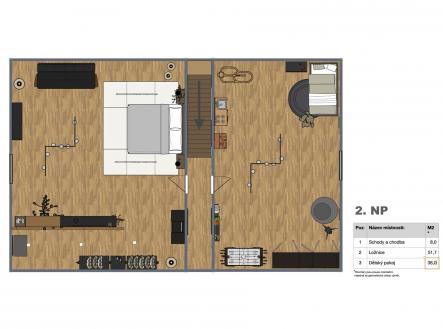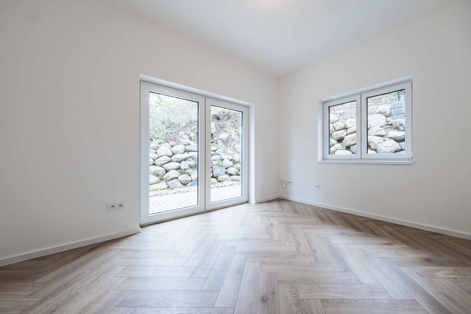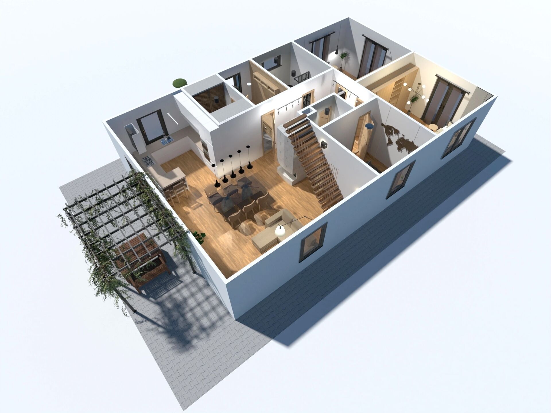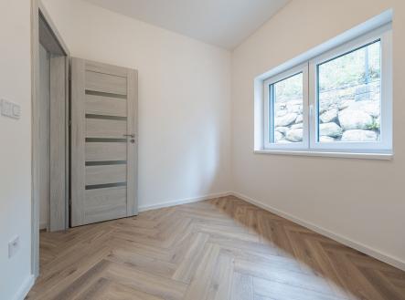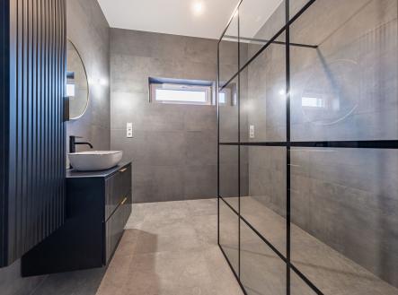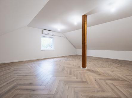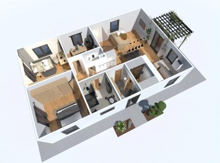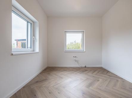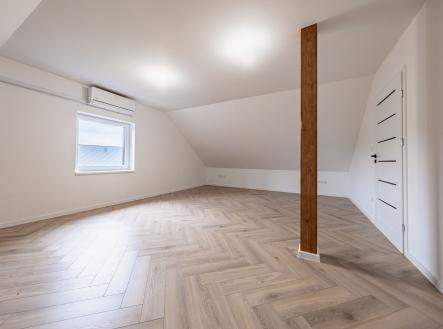 V přízemí najdete dvě ložnice, pracovnu (či pokoj pro hosty), koupelnu s walk-in sprchou a samostatnou toaletu. Z každého pokoje je vstup na terasu obklopující dům. V patře vás čekají další dvě prostorné místnosti se šikminami – ideální pro dětské pokoje, hernu, ateliér nebo šatnu snů.