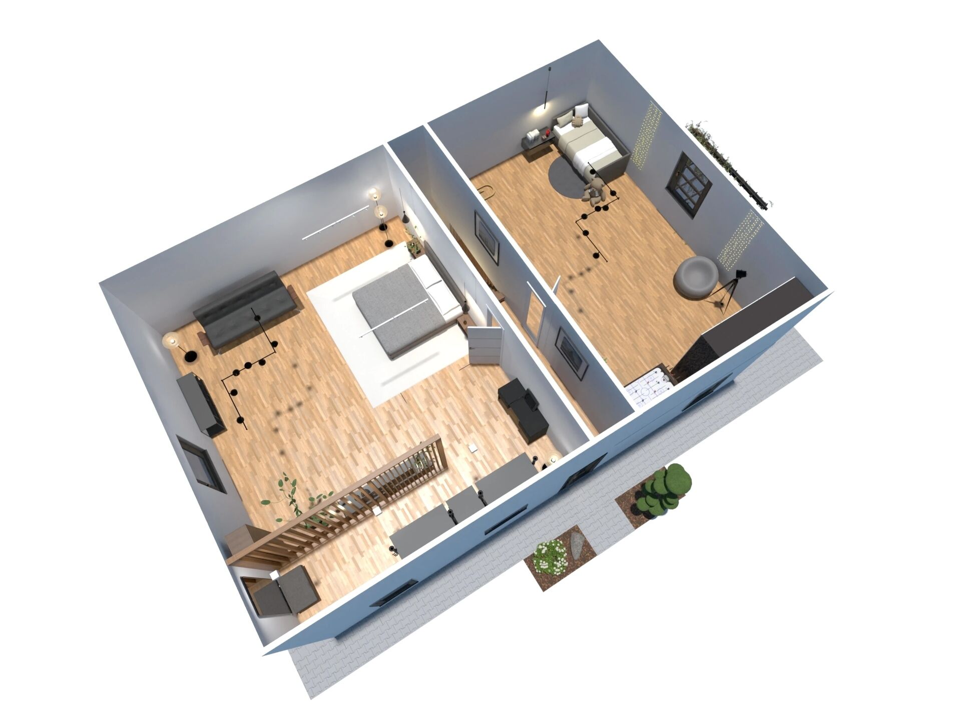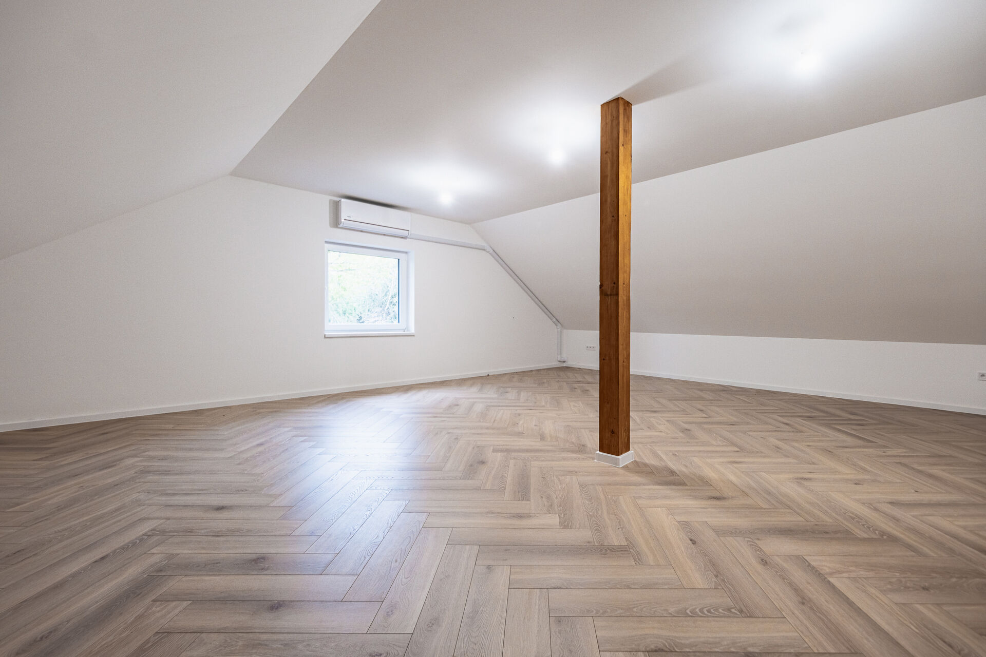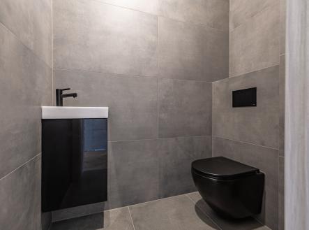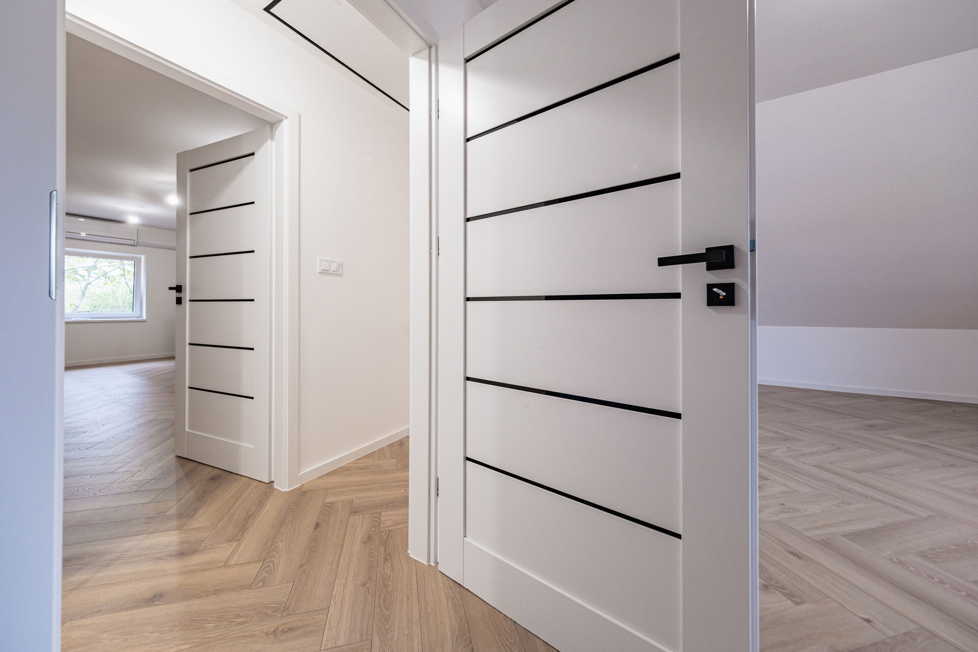 V přízemí najdete dvě ložnice, pracovnu (či pokoj pro hosty), koupelnu s walk-in sprchou a samostatnou toaletu. Z každého pokoje je vstup na terasu obklopující dům. V patře vás čekají další dvě prostorné místnosti se šikminami – ideální pro dětské pokoje, hernu, ateliér nebo šatnu snů.