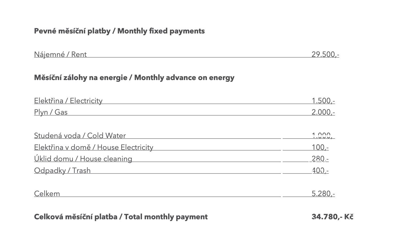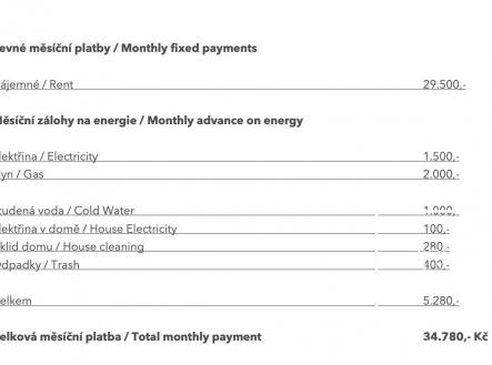 na 5.280,- zálohy na energie a služby (z toho je 1.000,-/měs. vodu, 400,-/měs. na odvoz odpadu, 1.500,-/měs. na elektřinu v bytě, 2.000,- plyn, 100,-/měs. elektřina společných prostor, 280,-/měs. úklid společných prostor). Byt je v perfektním stavu a připravený k nastěhování. Byt je vybaven tak jak je vyobrazeno na fotkách. Je vytápěn ústředním topením s vlastním plynovým kotlem. Při nastěhování se platí 34.780,- nájemné na první měsíc + 34.780,- kauce + 34.780,- provize.