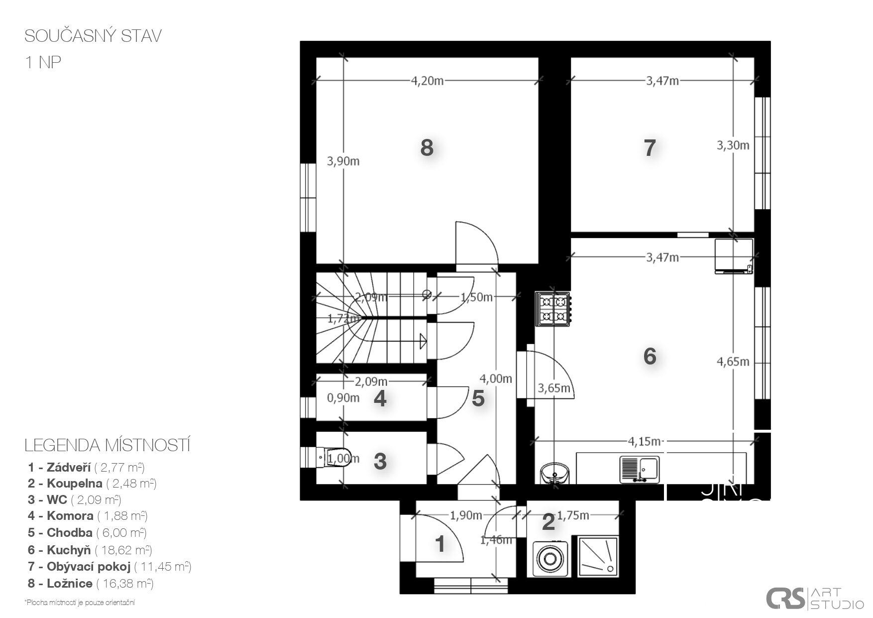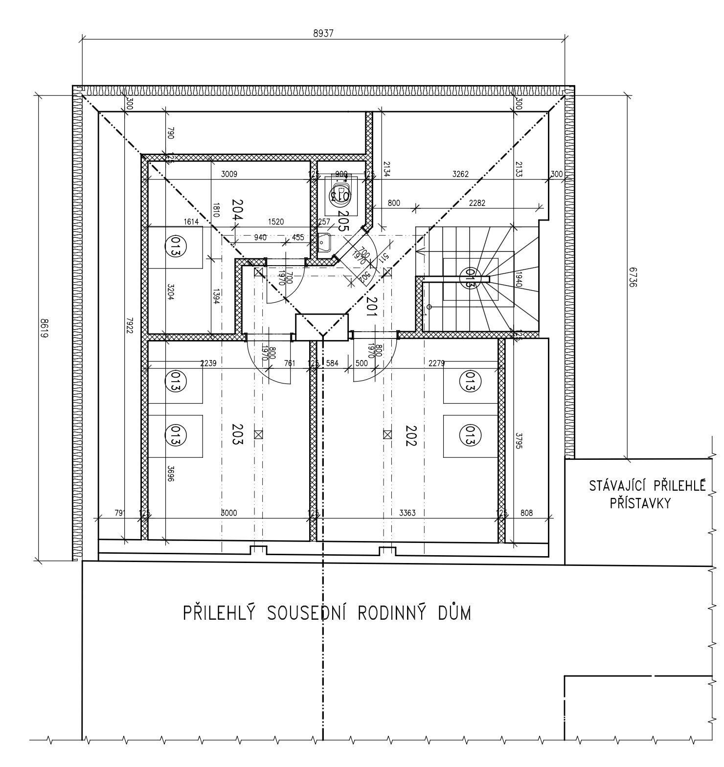 Rodinný dům má 2 nadzemní podlaží. Aktuálně je v 1. NP byt s dispozicí 2+1 s koupelnou a wc. V 2.NP je možné vybudovat podkrovní vestavbu, přičemž půda je vysoká a umožňuje bezproblémovou plnohodnotnou vestavbu dalších tří pokojů a wc, bez nutnosti zvyšovat střechu.