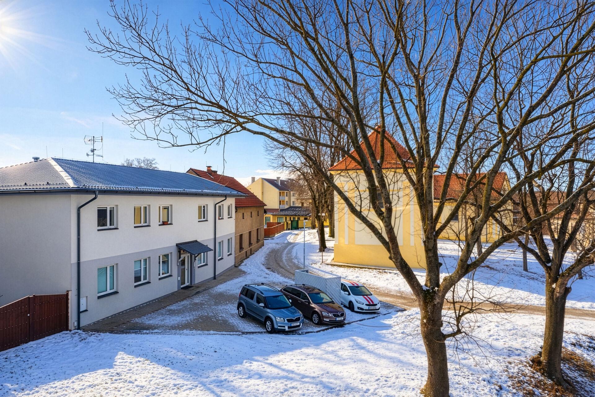 K domu náleží tři parkovací stání na vlastním pozemku, přičemž jedno parkovací stání je přímo k tomuto bytu. Další parkování je možné pohodlně v okolí. Bonus navíc představuje příprava na nabíjení elektromobilů, společná technická místnost a úklidová komora.