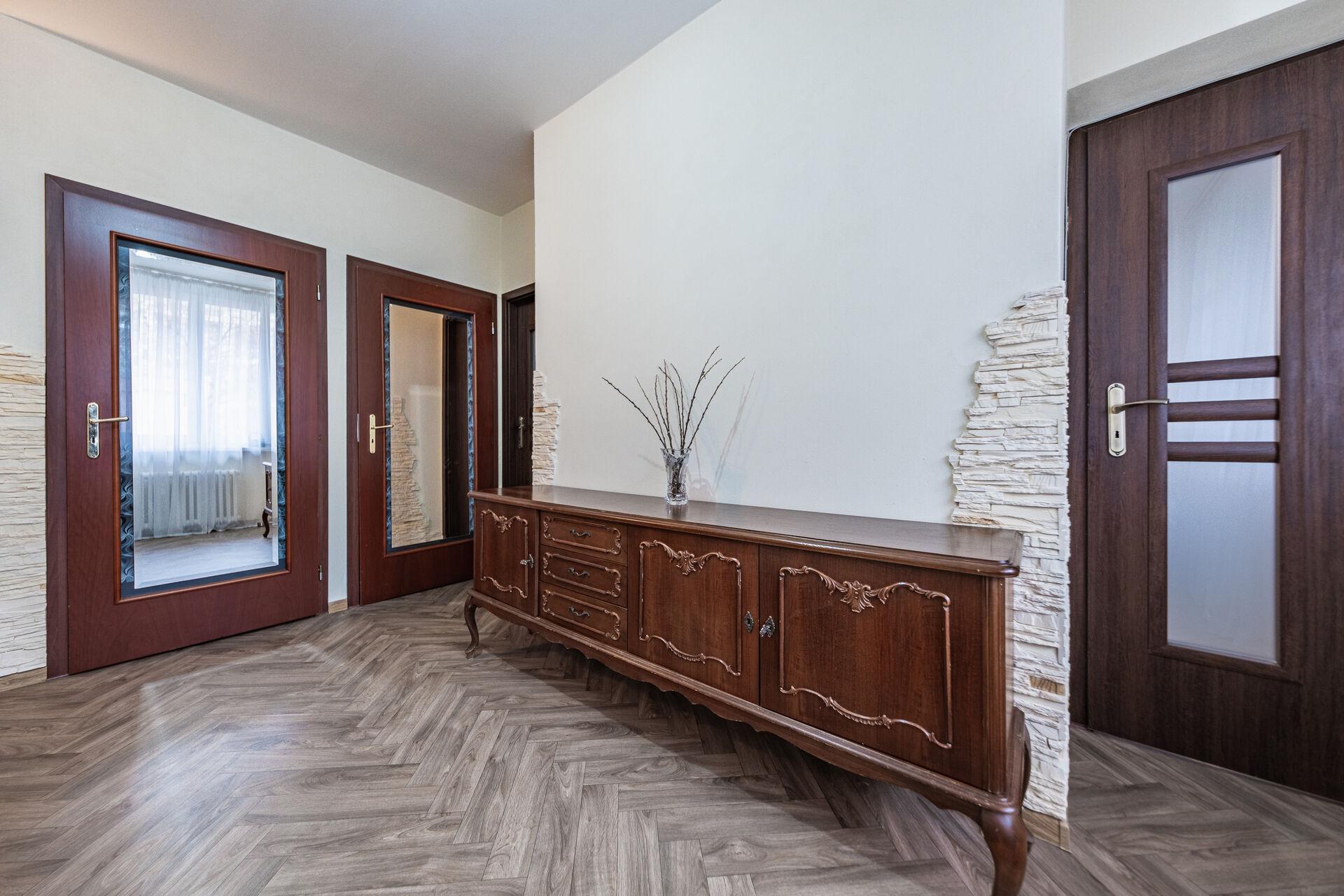 Dispozice bytu je velmi praktická, vstupní hala se dvěma komorami, tři samostatné pokoje s vestavěnými skříněmi na míru, nová kuchyně, samostatné WC, koupelna s vanou a další komora na potraviny.