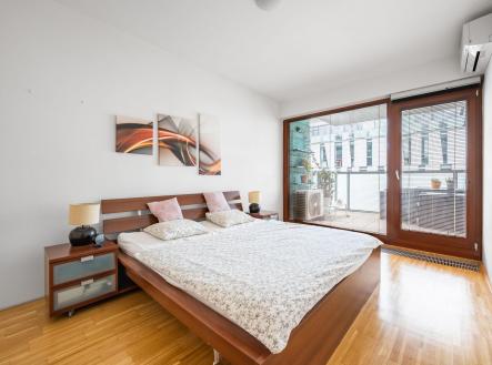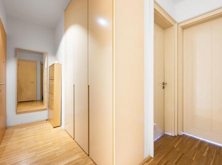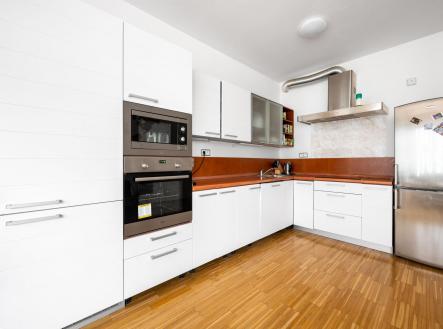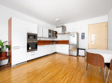 Dispozici bytu tvoří předsíň s vestavěnou skříní, prostorný obývací pokoj, jídelní část s kuchyňským koutem, plně vybavená spotřebiči, ložnice včetně postele, koupelna s vanou a samostatné WC. Podlahy dřevěné, vnitřní žaluzie, klimatizace, domácí telefon.