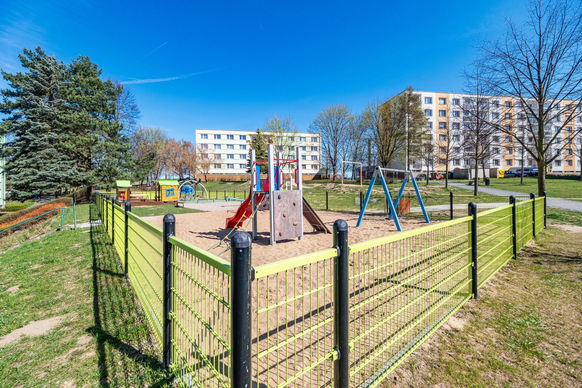 Nové dětské hřiště, kde se děti zabaví a Vy je máte na očích. Lokalita je přesně taková, jakou chcete pro běžný život.