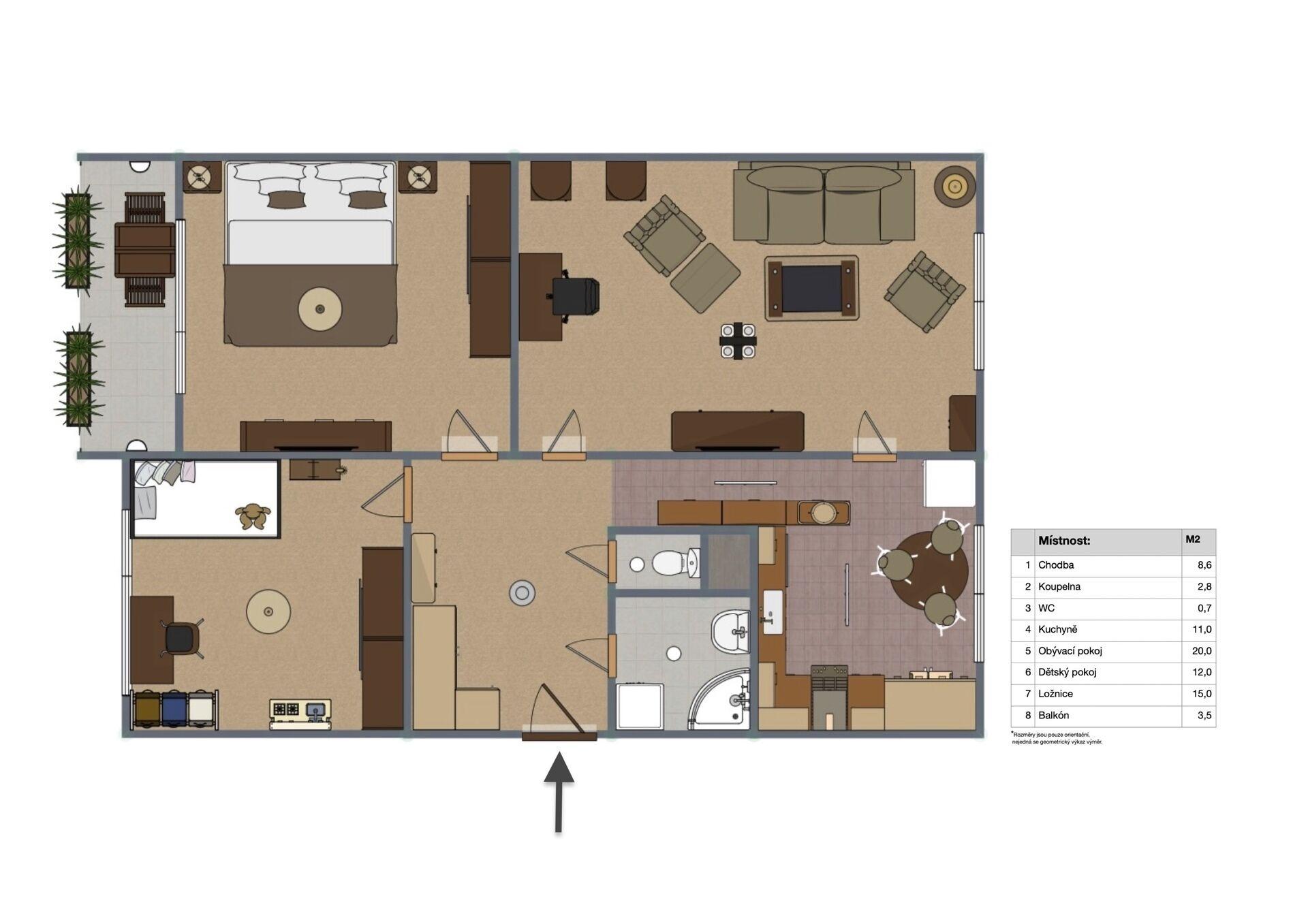 Jedná se o dispozici 3+1 s balkónem a sklepem o celkové výměře 78,71 m² – z toho samotný byt má 70,7 m²,sklep 4,32 m² a balkón 3,2 m².