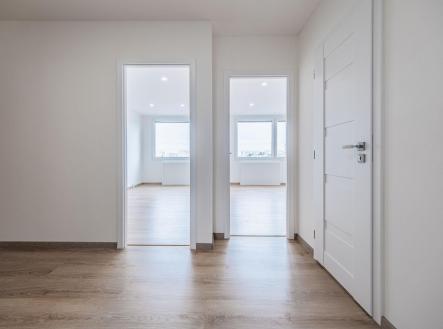 Dispozice bytu je velmi praktická a příjemná – z prostorné chodby vstupujete do dvou samostatných pokojů (ložnice a dětský pokoj/pracovna), dále do koupelny, samostatného WC a dominantou bytu je světlý obývací pokoj s kuchyňským koutem. Odtud je přímý vstup na terasu, která nabízí krásný, klidný výhled do zeleně vnitrobloku – ideální místo pro ranní kávu nebo večerní odpočinek.